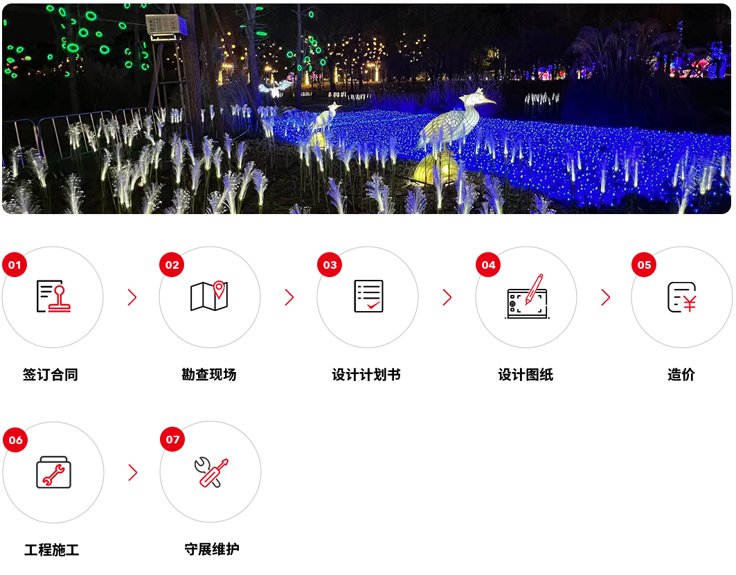 公司設(shè)計團(tuán)隊集合多年國際上新的設(shè)計理念、運用燈光科技,將制作精巧、創(chuàng)意絕倫的彩燈通過傳統(tǒng)與時尚、文化與生態(tài)的結(jié)合,讓彩燈這傳統(tǒng)文化更富有視覺沖擊力和感染力。