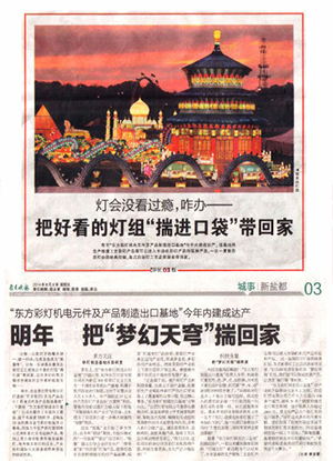 “東方彩燈制造出口基地”對產(chǎn)業(yè)的升級帶動力還不止這些。自貢燈貿(mào)有限公司已經(jīng)先后在國內(nèi)200多個城市,國外30多個國家和城市進行展覽展銷,境外觀展人次超過2000萬,其文化產(chǎn)品出口創(chuàng)匯名列全川前茅。“分析這么多年的外展外銷,我們發(fā)現(xiàn)了歐美市場在圣誕節(jié)期間的彩燈需求量巨大,因此基地將在這一塊上下功夫。”蔡翔透露,基地預(yù)計將在今年內(nèi)建成投產(chǎn),“希望將美輪美奐的自貢彩燈奉獻給世界這個大舞臺。”