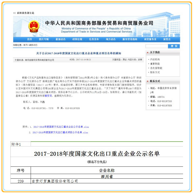 自貢燈貿集團股份有限公司入錄“2017-2018年度國家文化出口重點企業”公示名目。這是自貢燈貿集團股份有限公司自2007年以來,第六次榮獲此殊榮,也是全國彩燈行業唯一連續六屆十二年獲此殊榮的企業。