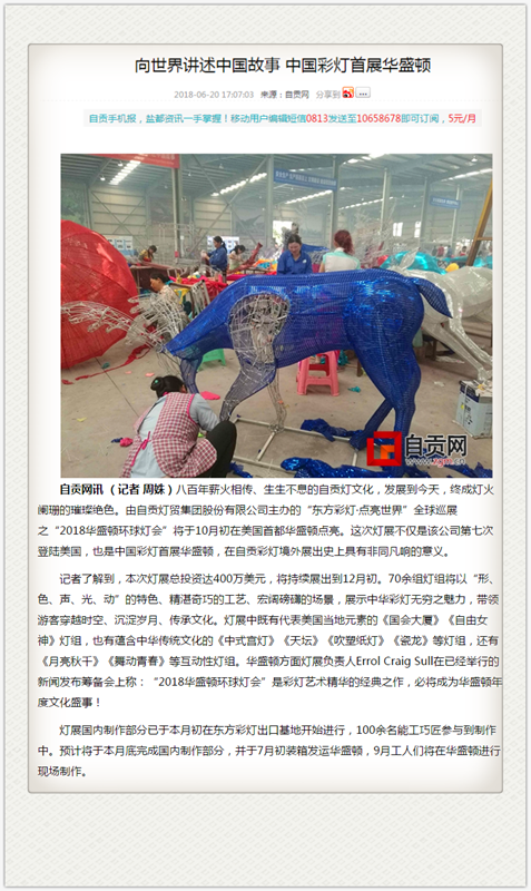自貢燈貿(mào)集團(tuán)股份有限公司主辦的“東方彩燈·點(diǎn)亮世界”全球巡展之“2018華盛頓環(huán)球燈會”即將于2018年10月-12月在Washington D.C隆重展出。本次燈展國內(nèi)制作燈組已于6月底完成裝箱啟運(yùn)。