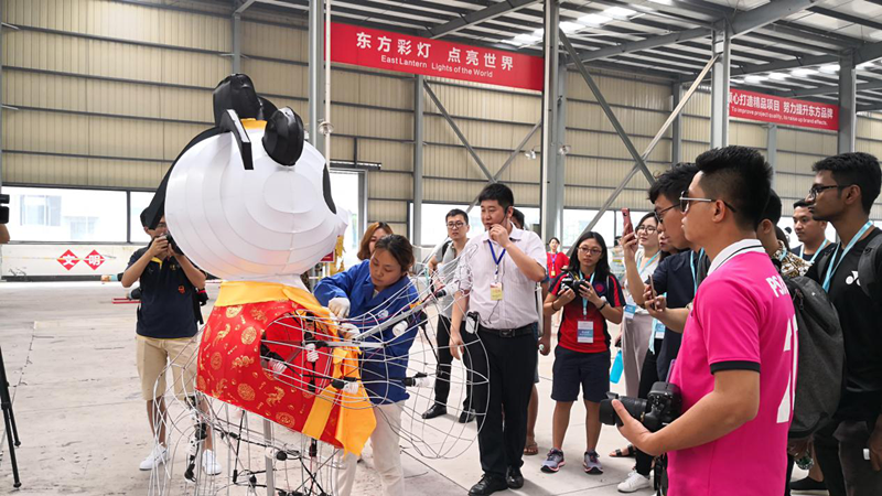 走進東方彩燈出口基地,來到“東方彩燈 點亮世界”項目境外燈展制作現場,青年朋友們近距離的詳細了解了彩燈的制作流程和工藝。交流團成員為東方彩燈足跡遍布世界30多個國家咋咋稱奇,為燈貿集團精妙絕倫的彩燈頻頻點贊。
