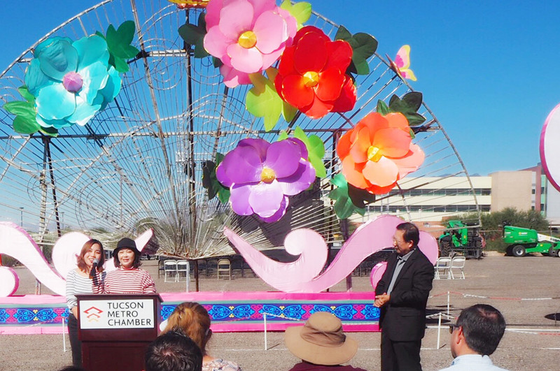 璀璨絢麗、獨(dú)具神韻的“2018世界之光圖森彩燈嘉年華”于11月7日在美國西部城市圖森華彩綻放。燈展受到當(dāng)?shù)卣蜕鐣?huì)各界的廣泛關(guān)注。Pima郡行政長官、圖森市常務(wù)副市長、市議會(huì)議員、郡商會(huì)會(huì)長、市大都會(huì)商會(huì)董事長、市旅游局局長、市交通局局長等美方官員出席開幕式。