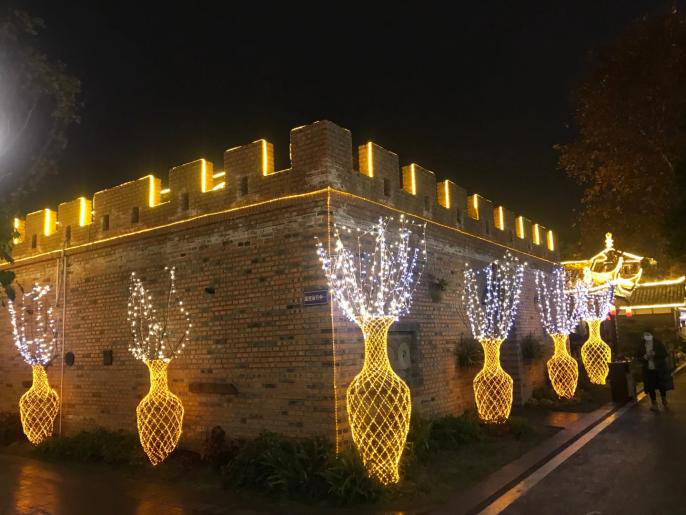 燈貿集團承制的“吃耍成都—龍騰梵谷燈之夜”文旅消費新場景,以溫情祥瑞為主題,契合園區特色,依景布設,用生動的彩燈藝術呈現了一臺清新脫俗的光影夜宴,為游人和食客創造了別樣的夜游體驗。