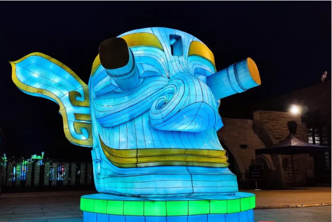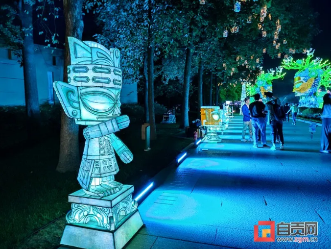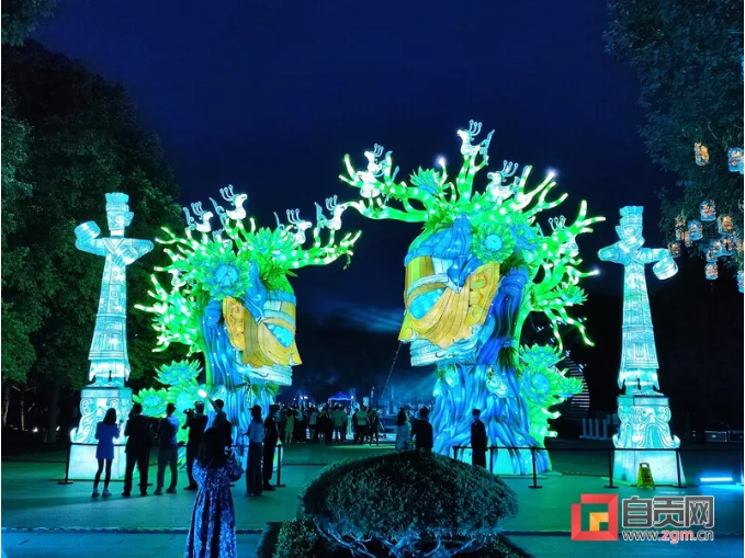 這次燈展由中青旅聯科策劃、自貢燈貿集團打造,設計靈感都來自于三星堆實體文物、考古發現,包括包括青銅大立人、青銅縱目面具、青銅神樹、黃金面具、青銅神鳥等。