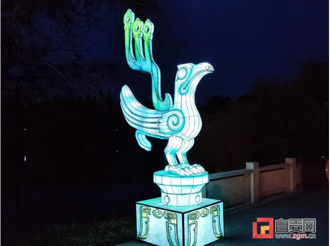 鳥與古蜀的關系十分密切,三星堆館藏文物中有眾多的鳳鳥形器物及紋飾圖案,在此次燈展中,也有不少以鳥為元素進行設計。其中一組以青銅鳳鳥為設計原型的燈組,兩只相似但不相同的高2.8米的鳳鳥燈組立于入口兩側通道處。