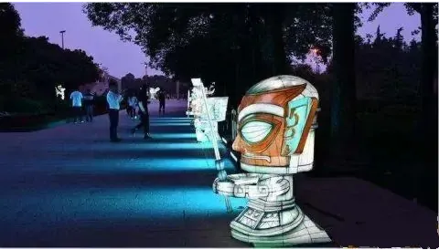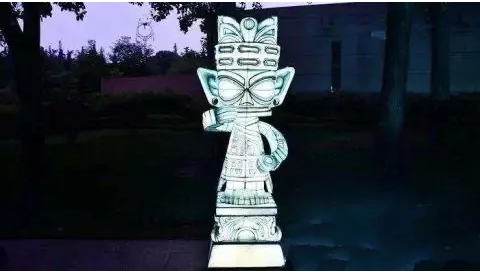 據自貢燈貿集團設計總監陳潔介紹,在入口廣場處的燈組以青銅縱目面具為設計原型,作為三星堆“六大國寶”之一的青銅縱目面具,寬1.38米,高0.645米,眼睛呈柱狀向外凸,是館藏中形體最大的青銅面具。本燈組按比例還原青銅縱目面具,燈組高3.2米,寬3.4米。