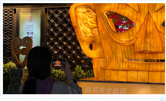 高仿真復原的古蜀文物造型燈組制作精美。在文物原件基礎上放大40倍制作而成的黃金面具燈組呈現出王者之氣的風范,青銅立人、小金面具、喇叭形金器等6件文物造型燈組環伺左右,立體呈現古蜀先民的高超智慧。