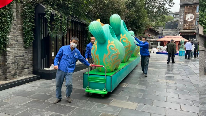 滿繪彩色圖案的金沙象牙燈組、文物造型設計燈組《嗚嚕嚕》,演繹著傳統文化的“國潮”新風尚,彰顯著文創帶給這座城市的新鮮感和創造力。分布在寬窄巷子景區燈組,讓游客一腳踏入光影幻境中的古蜀王國。